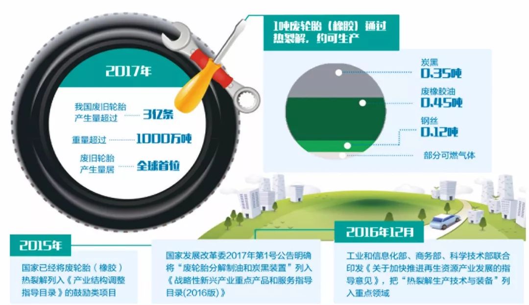 2015年,國家已經(jīng)將廢輪胎(橡膠)熱裂解列入《產(chǎn)業(yè)結(jié)構(gòu)調(diào)整指導(dǎo)目錄》的鼓勵(lì)類項(xiàng)目。國家發(fā)展改革委2017年第1號公告明確將“廢輪胎分解制油和炭黑裝置”列入《戰(zhàn)略性新興產(chǎn)業(yè)重點(diǎn)產(chǎn)品和服務(wù)指導(dǎo)目錄(2016版)》,2016年12月份,工業(yè)和信息化部、商務(wù)部、科學(xué)技術(shù)部聯(lián)合印發(fā)《關(guān)于加快推進(jìn)再生資源產(chǎn)業(yè)發(fā)展的指導(dǎo)意見》,把“熱裂解生產(chǎn)技術(shù)與裝備”列入重點(diǎn)領(lǐng)域。