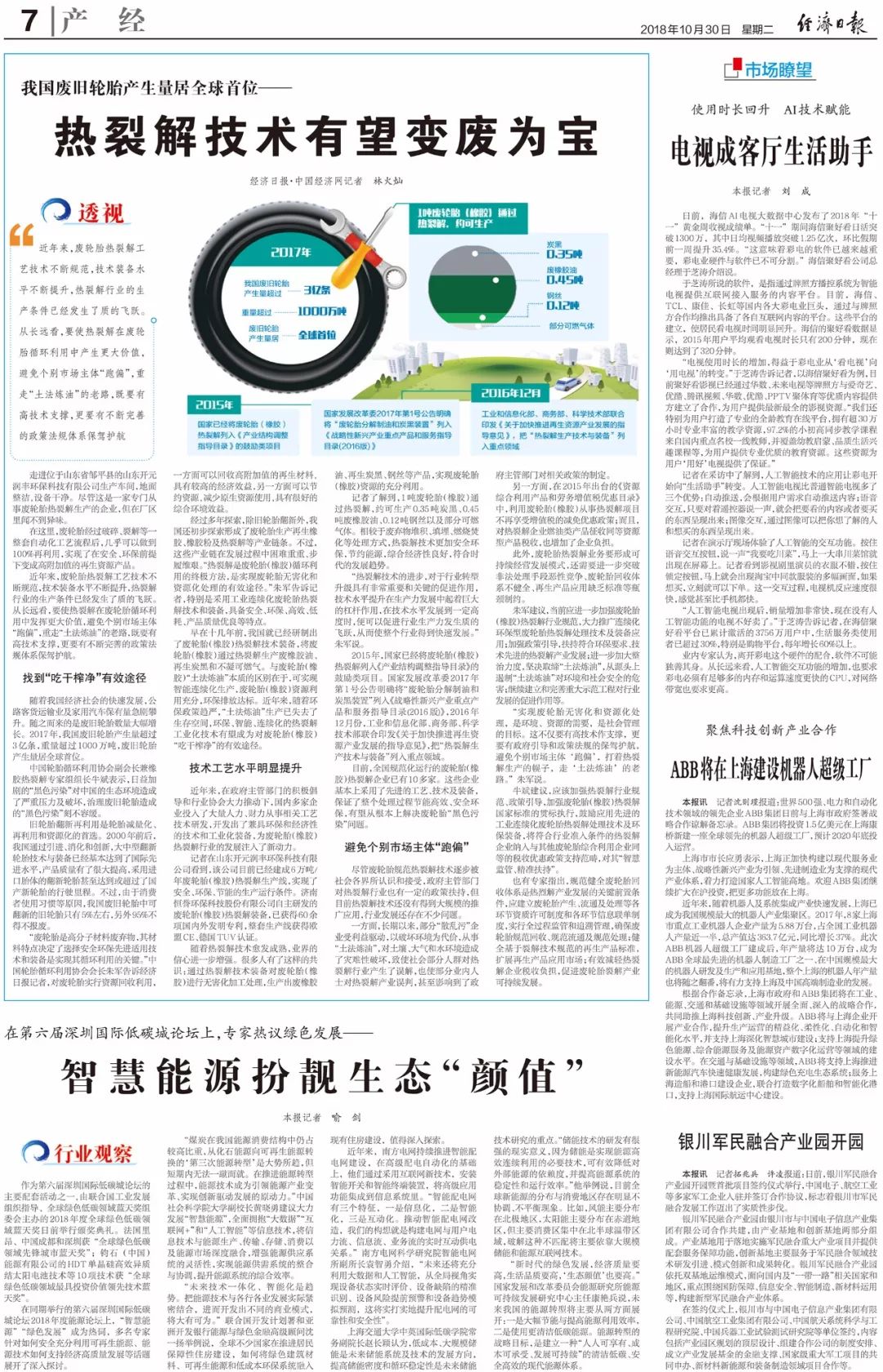 近日,《經(jīng)濟(jì)日報(bào)》 、《中國經(jīng)濟(jì)網(wǎng)》主任記者林火燦采訪了中國輪胎循環(huán)利用協(xié)會會長朱軍以及中國輪胎循環(huán)利用協(xié)會副會長兼橡膠熱裂解專家組組長、濟(jì)南恒譽(yù)環(huán)??萍脊煞萦邢薰径麻L牛斌及行業(yè)相關(guān)專業(yè)人士,并參觀了采用濟(jì)南恒譽(yù)環(huán)保技術(shù)裝備,入選工信部《廢輪胎綜合利用行業(yè)準(zhǔn)入條件》的廢輪胎熱裂解項(xiàng)目,就廢輪胎污染、循環(huán)再生利用技術(shù)、熱裂解行業(yè)發(fā)展前景及相關(guān)政策等問題與各位專家進(jìn)行了深入交流。并依據(jù)采訪內(nèi)容撰寫題為《我國廢舊輪胎產(chǎn)生量居全球首位——熱裂解技術(shù)有望變廢為寶》的文章,刊登于《經(jīng)濟(jì)日報(bào)》。
