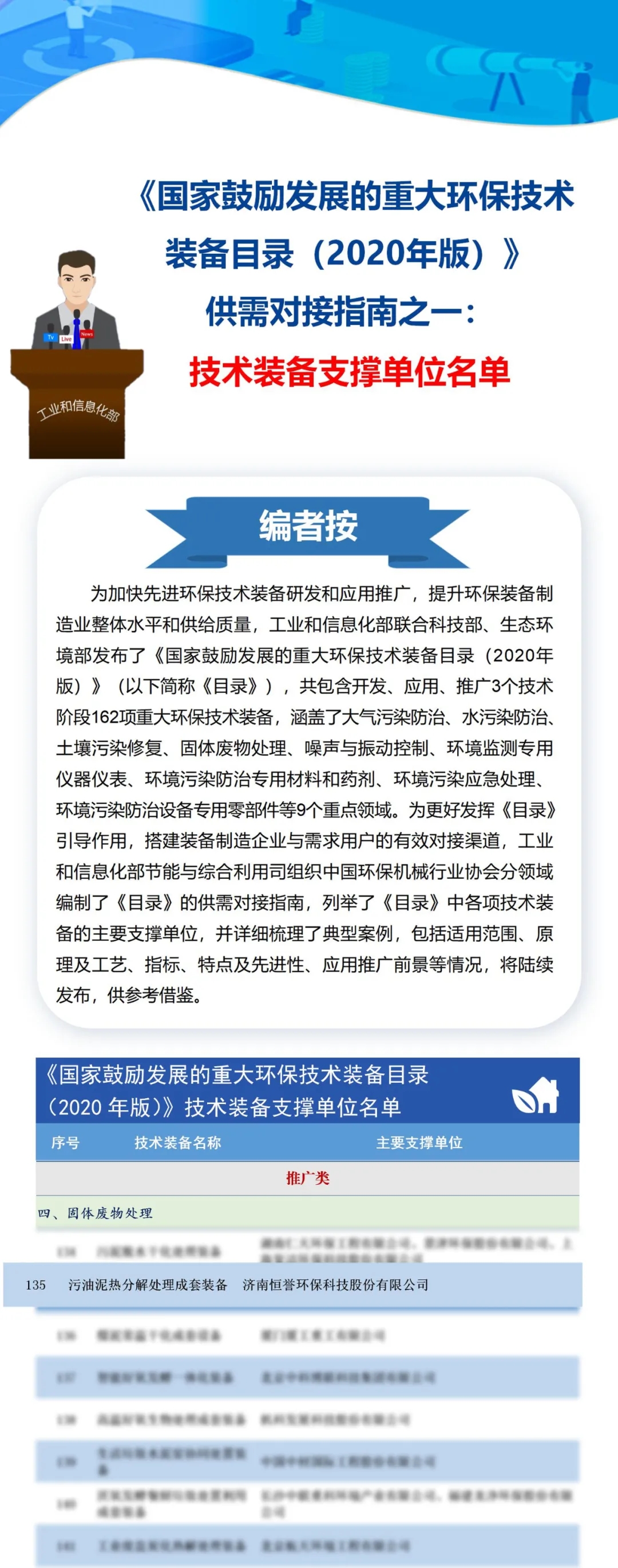 今日,工信部官網(wǎng)公示了《國(guó)家鼓勵(lì)發(fā)展的重大環(huán)保技術(shù)裝備目錄(2020 年版)》供需對(duì)接指南之一:技術(shù)裝備支撐單位名單,濟(jì)南恒譽(yù)環(huán)??萍脊煞萦邢薰境蔀閲?guó)家鼓勵(lì)發(fā)展的重大環(huán)保技術(shù)裝備“污油泥熱分解處理成套裝備”技術(shù)裝備支撐單位。
